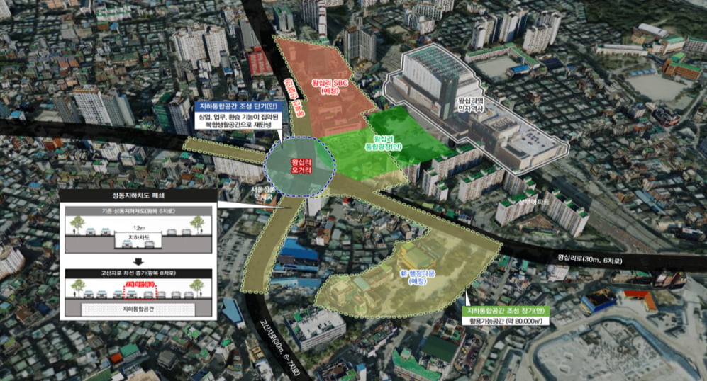 성동구 왕십리 입체도시 조성계획에는 왕십리 비즈니스센터(SBC) 개발이 담겨있다. 현재 성동구청과 성동경찰서 등 행정타운이 위치한 상업지역을 SBC로 개발하고, 행정타운은 왕십리로 남쪽으로 이전한다는 구상이다. 왕십리역 민자역사와 왕십리오거리, 왕십리 SBC 중심에 위치한 부지는 왕십리 통합광장으로 재조성한다. 왕십리오거리를 지나는 고산자로 성동지하차도는 상부로 올리고 하부 공간은 동북선 왕십리역과 함께 주민을 위한 상업·업무공간으로 바꾼다.