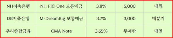 가장 추천하는 상품은 우리종합금융의 CMA Note 입니다. 금리만 따졌을 때는 위의 두 상품보다 약간 낮지만 한도가 무제한 이기 때문에 저 같으면 이 상품을 파킹통장으로 사용할 것 같습니다.
